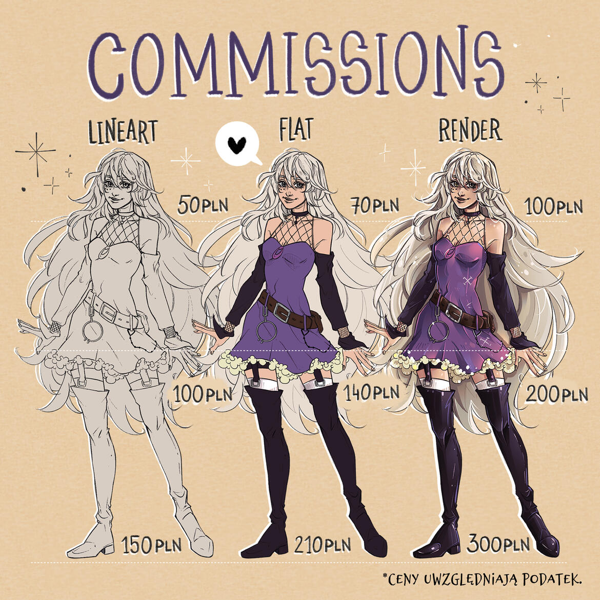 2. Ceny za zlecenia znajdziesz w zakładce „Commissions”. O dokonanie płatności poproszę po zatwierdzeniu ostatecznego szkicu. W wyjątkowych przypadkach możemy ustalić zaliczkę w wysokości 50%.